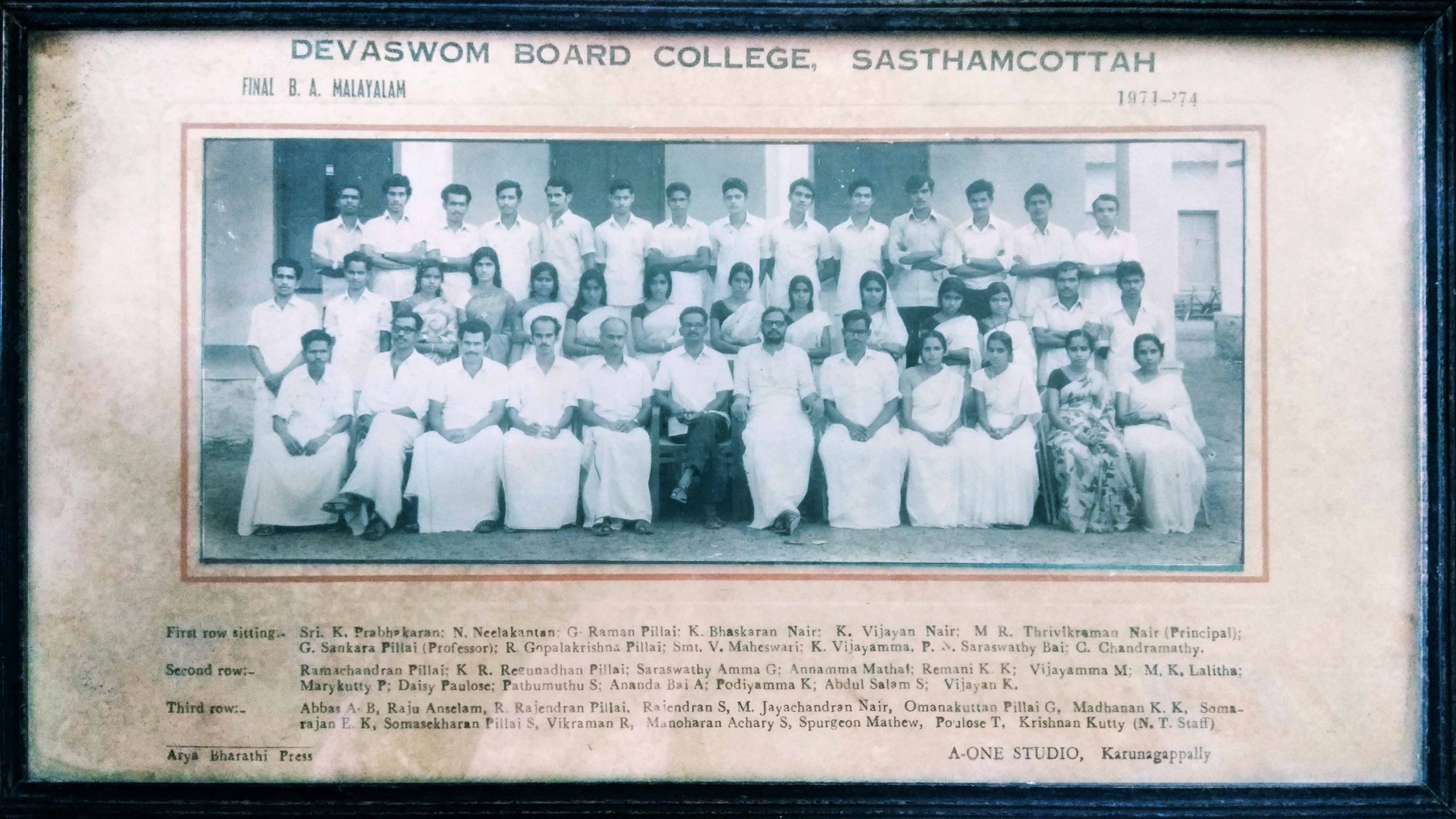 The Department is proud to place on record it could seat out 40 batches of BA Degree Students. In the beginning, there were only 25 students for B.A. Malayalam course. But none there are 40 seats and every year 40 to 60 Students are admitted to the course. The Department has been producing very good results all these years. More than 90% of the students pass the University examinations and nearly 30 percentage secure First Class every year. Malayalam department has formed and sent out many eminent personalities to the various fields of life. Many of them are working as teachers in colleges and schools. Some of them occupy very high positions in society. Sri. John Samuel is serving as the Asst. Director of Doordarshan, Mr. P.J. Radhakrishnan is, working as a producer in Doordarshan. Dr. B. Ananatha Krishnan is the director of the School of Performing in Hyderabad University. Renjilal is famous film Director, Mr. S. SanthoshKurup is well-known film actor, Sri P.R. Kurup, Dr. C Unnikrishnan, Dr. R.S Rajeev and Dr. Padmanabha Pillai are working as lecturers in DB Colleges, Dr. N .Anil Kumar who was the then First Rank holder of Kerala University B.A. Degree is now working in Sree Kerala Varma College, Trichur, Dr. K. Rajendran and Sri. S. Ajayan are Asso. Professors in MSM College, Kayamkulam, Dr. P. Vijayan is the Principal of Govt College, Dr. K. Abdul Azeez is Asso. Professor, Iqbal College (Retd.), Peringamala, Dr. R .BhadranAsso.Prof. (Retd.) inCatholicate College, Pathanamthitta, Sri. G. Thomas.Is working as Lecturer in FathimaMatha National College, Kollam. DrGirijaAsso.Professor N.S.S. College, Pandalam. Dr.K.B. Selvamony, Asso.ProfessorUniversity College, Dr. Ashraf NizaAsso.Professor, Women’s College, Trivandrum. Sri K.Krishna Kumar additional District Majistrate, Malayalam Critic and TV Anchor Dr.T.K. Santhosh Kumar are former students of the Department of Malayalam.