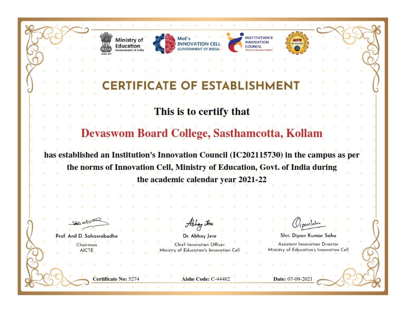 Kumbalathu Sankupillai Memorial Devaswom Board College has a MHRD recognised Institution’s Innovation Council (IIC) which functions as per the norms of the Government of India to create an ecosystem for innovation and cultivation of ideas among students and faculties to transform our graduates into job creators rather than job seekers. The IIC also act as a nodal agency to co-ordinate the activities of Idea Lab, ED Club, various departments, clubs etc. The council also conducts programs such as workshops, seminars for entrepreneurship development and facilitates tools for technology development and its implementation. IIC motivates and facilitates student participation in young innovator’s programs. The council aims at the institutional focus of creating an eco-system including incubation centre also provides infrastructural and technical support for establishment of start-ups. With these objectives the following programmes were organised by IIC.