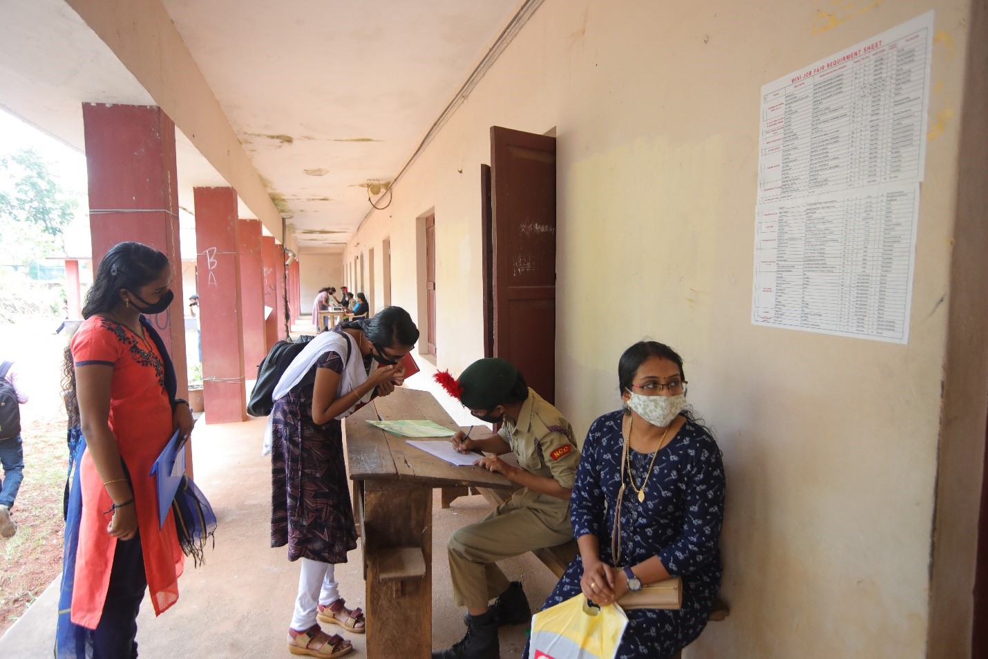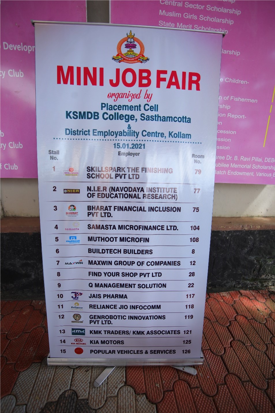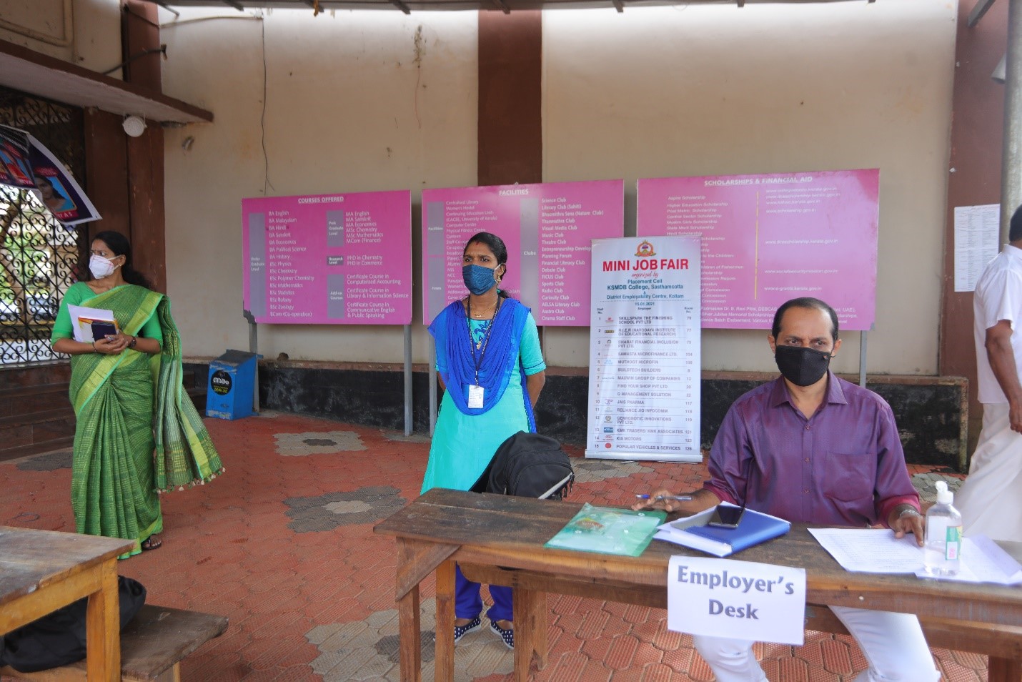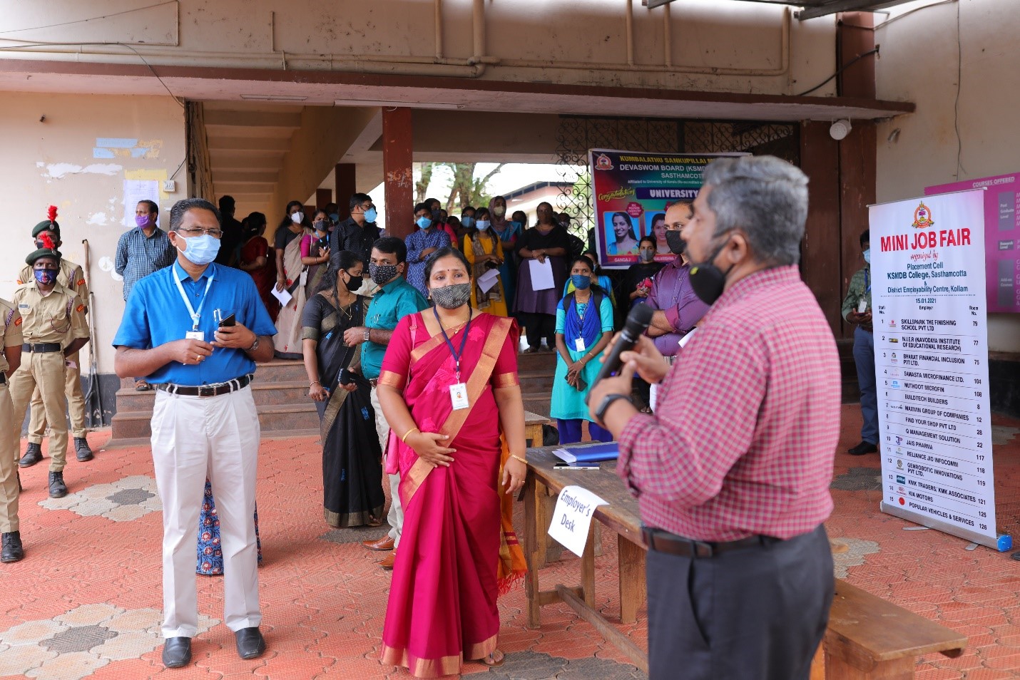 The Placement cell of KSMDB College in collaboration with the District Employability Centre, Kollam, Government of Kerala organized a Mini Job Fair in the campus on January 15, 2021. Fifteen reputed organizations from diverse fields participated with more than seven hundred reported vacancies. Participation was confirmed through online registration and it was limited to those who were with educational qualification of Plus Two (pass) and above within the age limit of thirty five years. More than thousand candidates registered online and were given time slot to attend the fair which was conducted strictly following Covid Protocol. The Fair began at 10:00 am with Parvathi. S, Convener, Placement Cell with her welcome speech. Dr. K S Anil Kumar, Principal, KSMDB College, Sasthamcotta presided over the meeting and Dr. V Jayasree, Coordinator, IQAC, Dr. Sushil Kumar R, Coordinator, NAAC, Lt. Dr T Madhu, ANO, NCC, and Dr. Ajesh S R, Member, Placement Cell felicitated the meeting. Sunrima K V, Joint Convener, Placement Cell proposed Vote of Thanks. Fifteen classrooms were converted to fifteen interview rooms and NCC Cadets were deployed outside each rooms to ensure the strict observance of Covid protocol as well as discipline. NCC wing of the college set up a food stall with breakfast, tea and light refreshment at the main entrance.