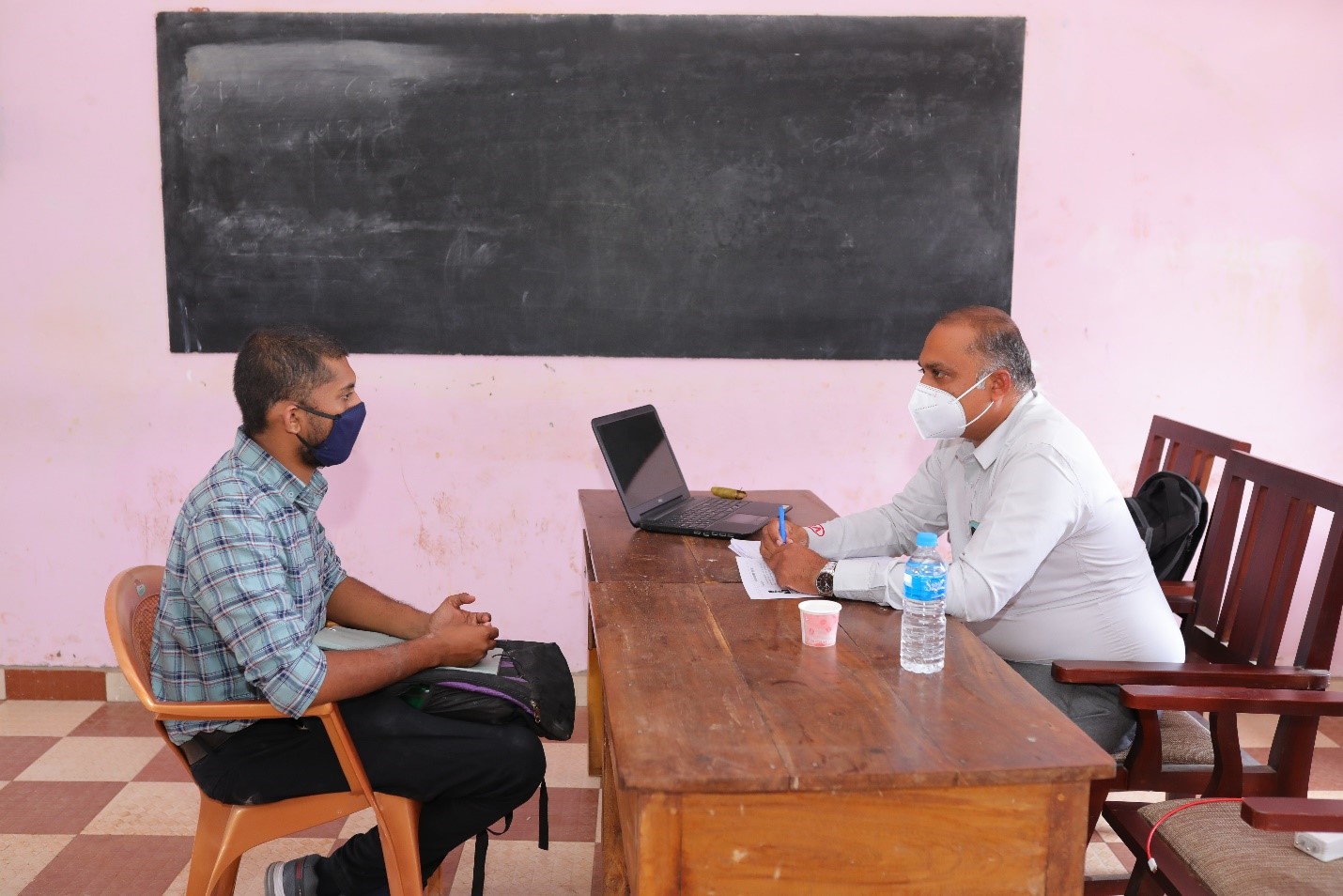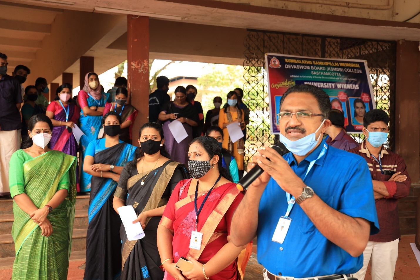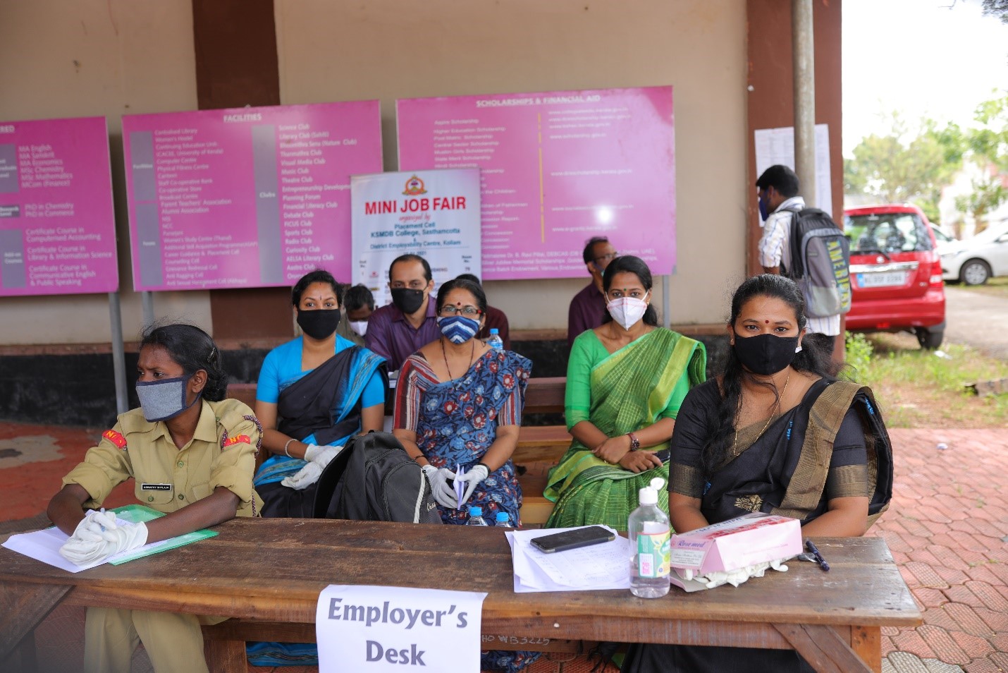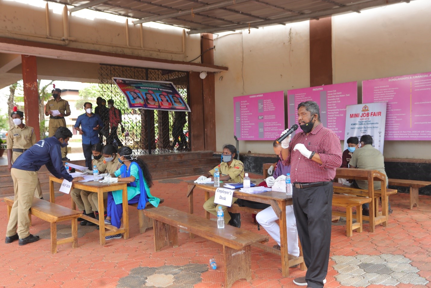 The Placement cell of KSMDB College in collaboration with the District Employability Centre, Kollam, Government of Kerala organized a Mini Job Fair in the campus on January 15, 2021. Fifteen reputed organizations from diverse fields participated with more than seven hundred reported vacancies. Participation was confirmed through online registration and it was limited to those who were with educational qualification of Plus Two (pass) and above within the age limit of thirty five years. More than thousand candidates registered online and were given time slot to attend the fair which was conducted strictly following Covid Protocol. The Fair began at 10:00 am with Parvathi. S, Convener, Placement Cell with her welcome speech. Dr. K S Anil Kumar, Principal, KSMDB College, Sasthamcotta presided over the meeting and Dr. V Jayasree, Coordinator, IQAC, Dr. Sushil Kumar R, Coordinator, NAAC, Lt. Dr T Madhu, ANO, NCC, and Dr. Ajesh S R, Member, Placement Cell felicitated the meeting. Sunrima K V, Joint Convener, Placement Cell proposed Vote of Thanks. Fifteen classrooms were converted to fifteen interview rooms and NCC Cadets were deployed outside each rooms to ensure the strict observance of Covid protocol as well as discipline. NCC wing of the college set up a food stall with breakfast, tea and light refreshment at the main entrance.