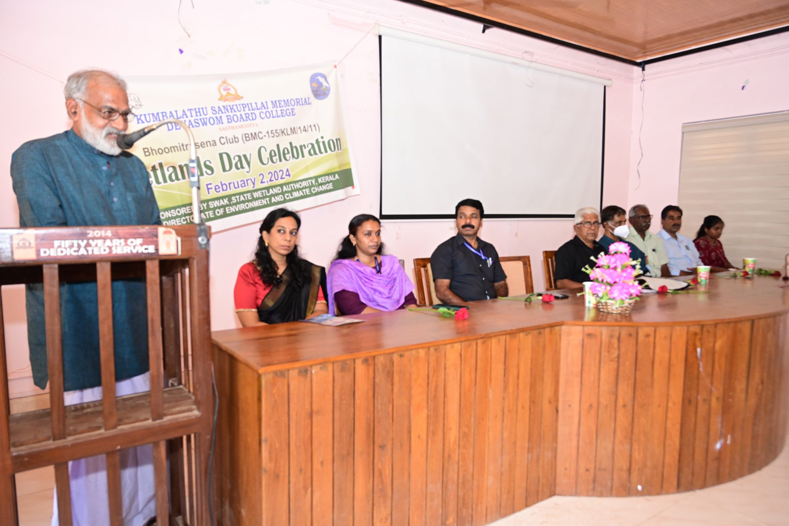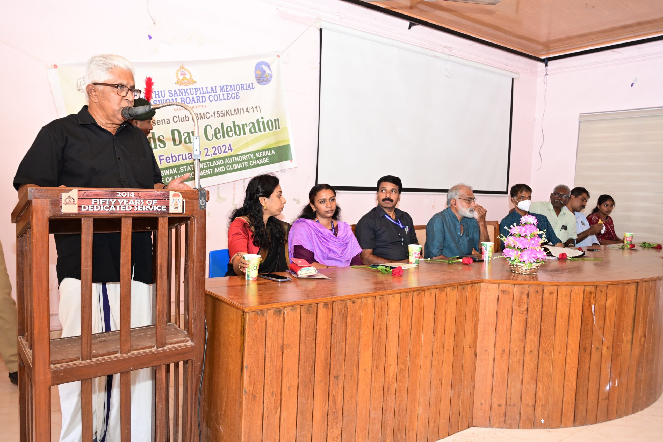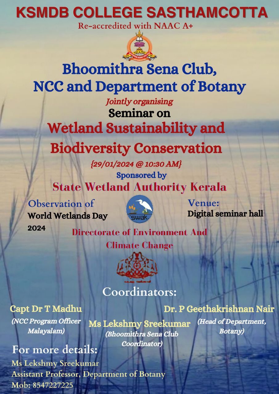 KSMDB College seminar on environmental sustainability and biodiversity conservation, organized by the Bhoomitrasena Club and sponsored by the Directorate of Environment and Climate Change, Trivandrum, marked the World Wetlands Day celebration in 2024. Ms. Lekshmy Sreekumar, FIC of Bhoomitrasena Club, welcomed attendees, while Capt. Dr. Madhu presided over the function. Prof. Dr. KC, Principal of KSMDB College Sasthamkotta, inaugurated the seminar. Renowned environmentalist and social worker Sri S. Babuji graced the event as the chief guest. Students from Bhoomitrasena Club, NCC, and the Department of Botany actively participated in the seminar.