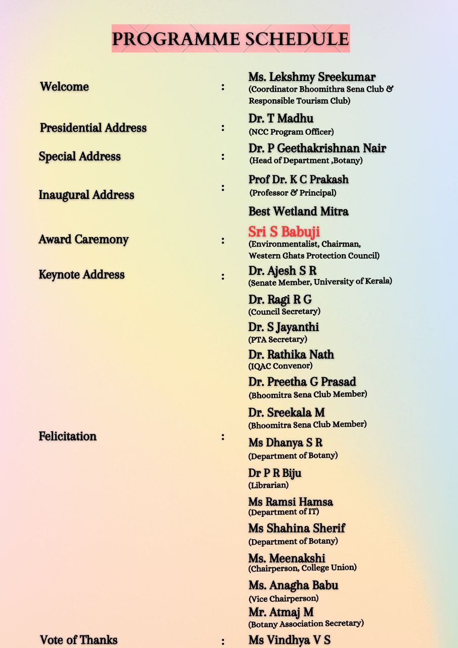 Chief guest distributed the prizes to Best Wetland Mitras.Adithya L of 3rd DC Botany and Krupa Biju of 3rd DC Hindi received the awards.