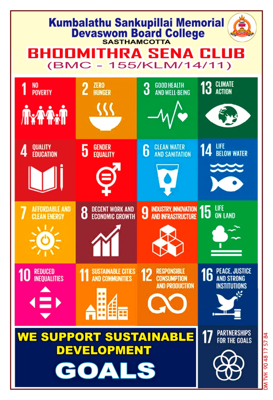 Bhoomithrasena club of KSMDB college aims at encouraging students towards the conservation of the environment .It's on the principle Restore, Recreate and Reimagine. This club marks its seal on every aspect of environmental-related issues as well as social and cultural scenarios.Protecting the ecosystem of the campus,it's various programmes include conservation of natural resources, waste management, anti-drug campaign,growing trees, greening cities, rewilding gardens, cleaning up the lake and so on. The club also conducts various intercollegiate competitions like poster making , video making ,drawing, and cartoon competitions to raise awareness among students.Ms.Lekshmy S Kumar of Department of Botany is the coordinator of the club.