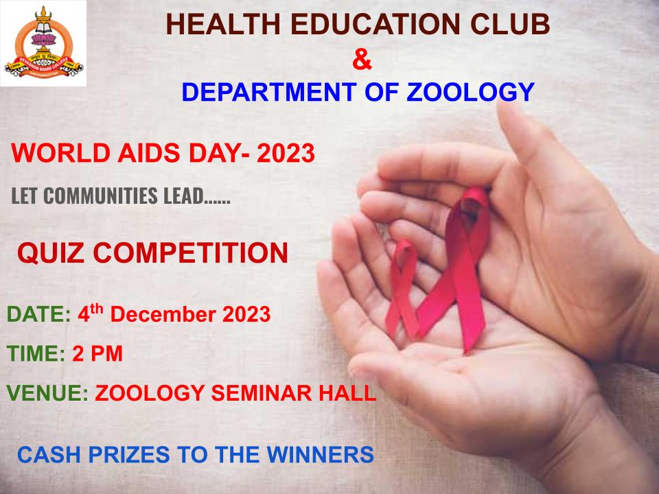 Dept. of Zoology in association with Health Education Club, KSMDBC conducted a Quiz competition as part of World AIDS Day- 2023, on 04th December 2023at 02.00 pm in Zoology Seminar Hall. Eighteen students participated in the Quiz programme. The programme was monitored by Dr. Manju. M ( HoD, Zoology).The Quiz was conducted in the individual mode and the answers were verified to declare the winners. The First Prize was awarded to Smitha V (III BSc Zoology), the Second Prize to Anjali Krishna (II BSc Chemistry) and the third prize was awarded to Gopika M (III BA Political Science). The Principal distributed Cash Prizes to the winners